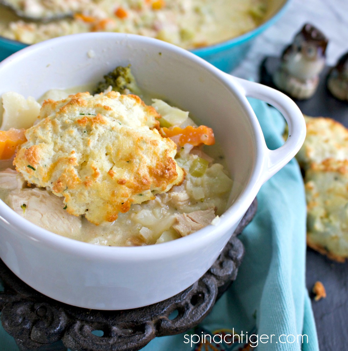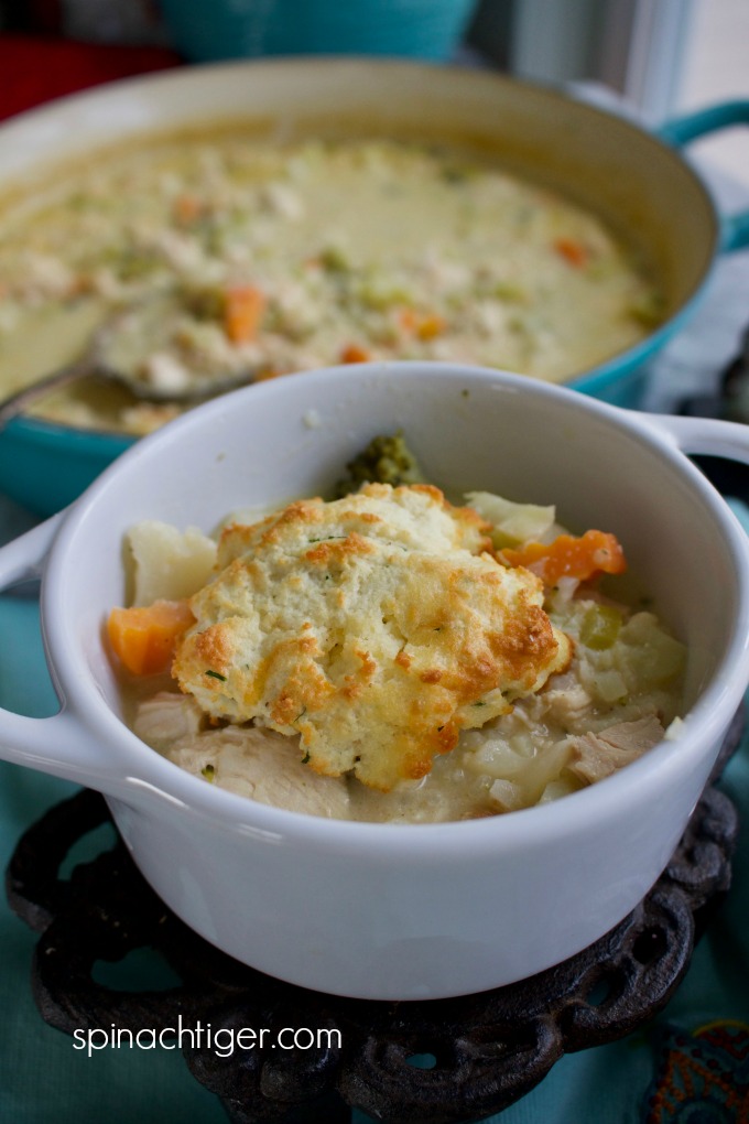 The biscuits are baked separately and put on the chicken right before serving, so they don’t get soggy.
