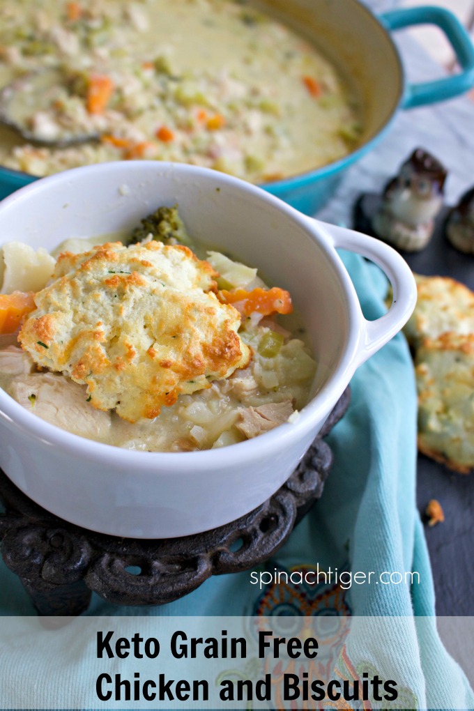 This is the best keto comfort food. You will still love the comfort of the creamy chicken and the crispy biscuits.