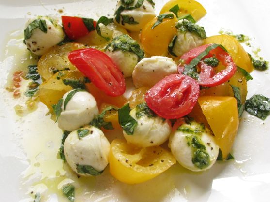 Caprese salad is typically mozzarella and tomatoes doused with a fruity olive oil, and garnished with fresh herbs, usually basil. It’s very simple, yet when properly prepared, it is elegant. Conversely, when improperly prepared, it can be a disaster.
