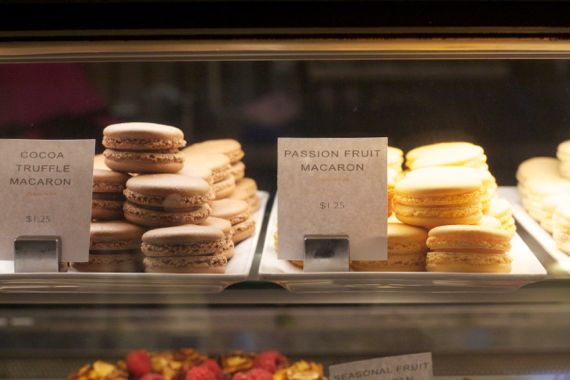 Passion fruit macarons in progress. They have twelve different flavors including pistachio, pink guava yuzu and cocoa truffle, all gluten free.